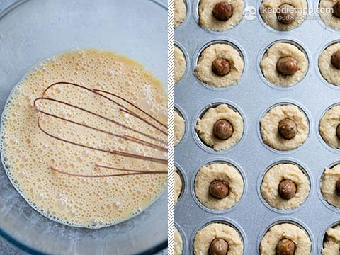 - Take your non stick mini muffin tin and spray each muffin case with olive oil to prevent sticking. Spoon 1 heaped teaspoon of batter to fill each mini muffin case and level to the top with a spatula.